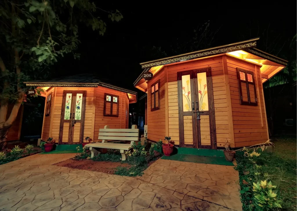Premium wooden chalets combining rustic aesthetics with modern amenities. Enjoy buffet meals, swimming pool access, Wi-Fi, air conditioning and adventure experiences.